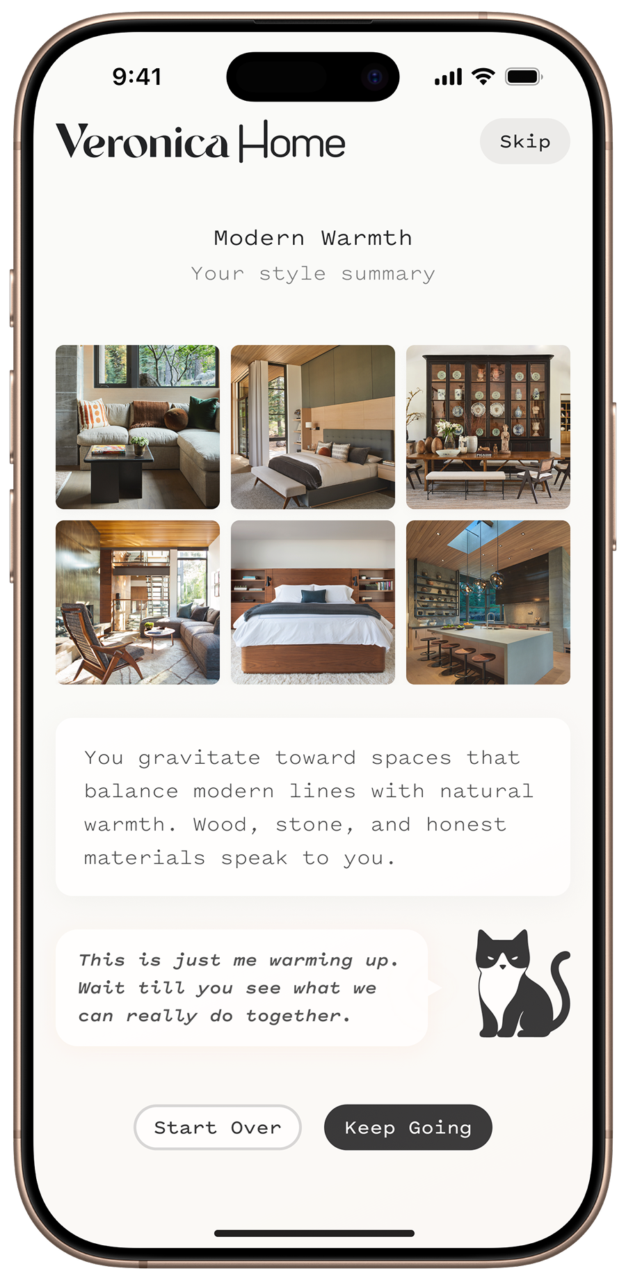 Two minutes of swiping and they have a style name, a color palette, and furniture picks — free, no sign-in. They screenshot their results and share them. Every user is the audience and the growth engine.