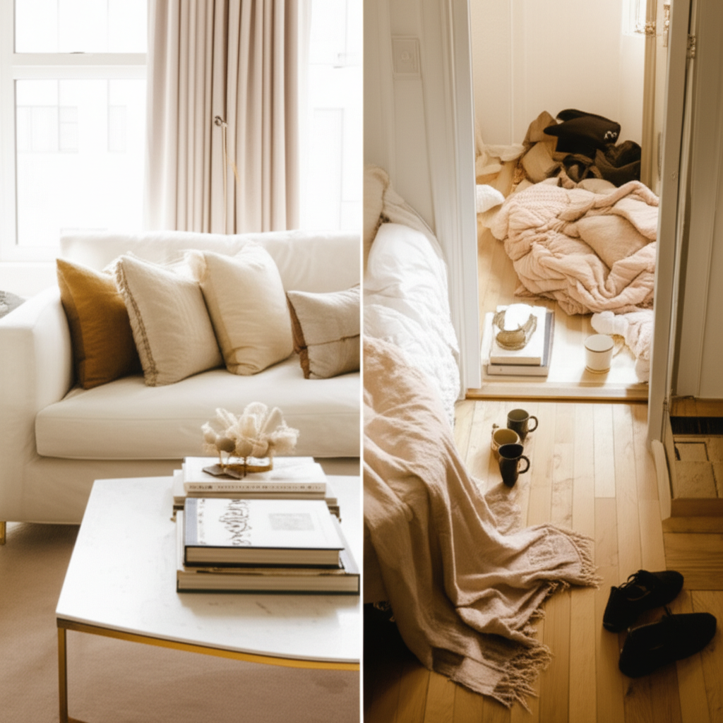 Pinterest board vs. actual apartment. Relatable gap between aspiration and reality.